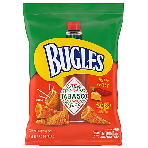 Bugles Hot & Cheesy Tabasco Pepper Sauce Crispy Corn Snacks 7.5 Oz