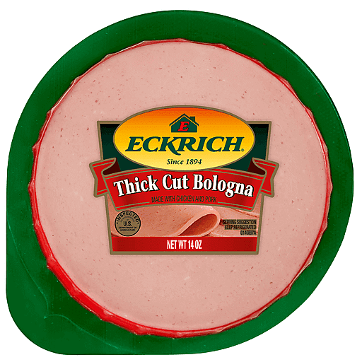 Eckrich Thick Bologna delivers the classic bologna taste you love in convenient thick slices so you're always prepared to make a quick sandwich. Made with chicken and pork, this gluten free lunch meat contains no by-products, soy, artificial colors or artificial flavors so you can feel good about adding it to school lunches. This thick cut bologna lunch meat comes in perfect ready to eat slices for minimal prep when you have a craving for bologna sandwiches. Layer pre sliced bologna on your favorite bread with cheese, tomatoes, lettuce and mayo for an easy, hearty meal at home, at work or on a picnic. For a quick snack, roll up a slice and dip in your favorite mustard or other sauce. When you want something hot for dinner, fry up a few slices of this classic deli meat and add to your sandwich with a fried egg and cheese for extra flavor. This bologna comes in a reclosable package for convenient use and storage in the refrigerator. Craftsmanship, care and pride are guaranteed with every Eckrich product.
