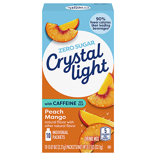 Crystal Light Naturally Flavored Peach Mango On-The-Go Powdered Drink Mix with Caffeine is a light and refreshing beverage you can enjoy anywhere. With zero grams of sugar and 5 calories per packet, Crystal Light is a sweet alternative to juice and soda and has 90 percent fewer calories than leading beverages (this product 5 calories, leading beverages 130 calories), so you don't have to choose between taste and calories. Each sugar free fruit drink mix packet also has 60 milligrams of caffeine so you can be at your best all day long. These 0.07 ounce individual powdered fruit drink packets in this 10 count box fit easily in your bag, pocket or car, so you can enjoy a refreshing glass of Crystal Light anywhere. Simply empty one packet of fruit drink powder into a bottle of water or a glass with 2 1/2 cups of water, shake or stir, and enjoy! All the flavor and only 5 calories per packet, just the way you like it.
