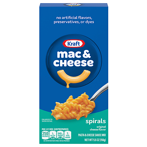 Help yourself to a bowl of comfort. Kraft Mac and Cheese Spirals is a convenient boxed dinner. Kids and adults love the delicious taste of macaroni with cheesy goodness. Our 5.5 ounce mac n cheese dinner includes spiral pasta and original flavor cheese sauce mix, so you just need milk and margarine or butter to make a tasty mac and cheese. Macaroni and cheese is a quick dinner kids love. With no artificial flavors, preservatives or dyes, Kraft Mac & Cheese is always a great family dinner choice. Preparing macaroni and cheese is a breeze. Just boil the pasta for 6-8 minutes, drain the water and stir in the cheese mix, milk, and margarine or butter. Kraft Mac & Cheese inspires the positive power of comfort.