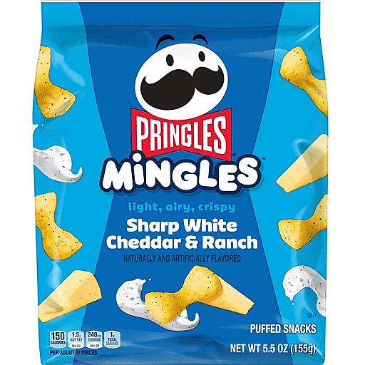 Pringles Mingles Sharp White Cheddar and Ranch are the light, airy, crispy puffed snacks that deliver two tasty flavors on one bowtie shaped puff! You’ve never seen Pringles quite like this before. We’ve created a delicious Pringles snack that's out of the can and into a bag. Every craveable bite is light, airy, and crispy on the outside, melt-in-your-mouth on the inside, and mixes two flavors for a delicious and satisfying snack experience; Pop open a bag and enjoy bite-sized, flavor-packed crispiness in a puffably fun bowtie shape. Pringles Mingles combines two flavors on every puff. Kick back and enjoy the savory, tangy combination of sharp white cheddar paired with zesty buttermilk and herb ranch. Whether you’re prepping for your next TV binge or hanging with the crew, get the ultimate snack fix with these irresistibly craveable puffs you can eat by the handful. Grab a bag of Pringles Mingles Sharp White Cheddar and Ranch and get ready to mix, mingle, and munch with Pringles.
