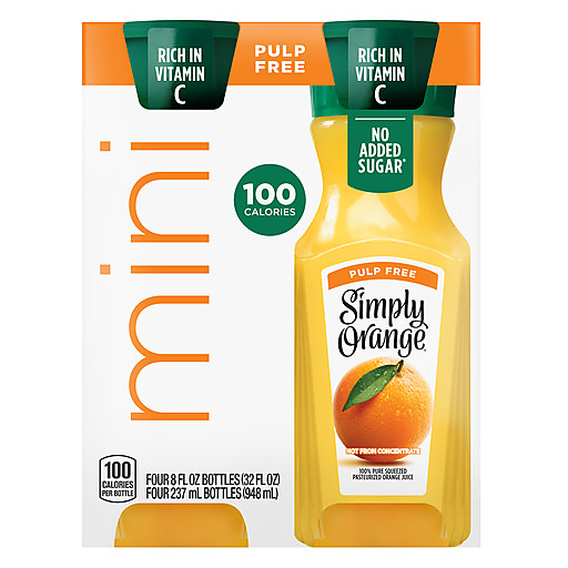 Simply Orange Pulp Free is a delicious orange juice with a taste that's the next best thing to fresh-squeezed. Try this premium, not-from-concentrate orange juice. Simply adheres to strict standards to ensure that the Simply Orange juices are the absolute best and guarantee fresh taste. With the Simply Orange Pulp Free juice, you can see the juicy goodness inside because Simply only uses transparent, proprietary packaging which is 100% recyclable. The single serve size in this 4-pack is very convenient for on-the-go consumption, served up in the 8 fl oz carafe for just 100 calories.